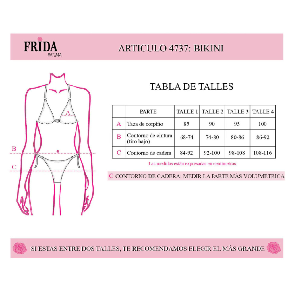 Talles y equivalencias aproximadas : 1 = 85 de corpiño , 2 = 90 de corpiño, 3 = 95 de corpiño, 4 = 100 de corpiño.