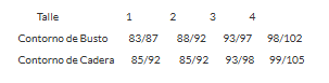 Talles y equivalencias aproximadas : 1 = 85 de corpiño , 2 = 90 de corpiño, 3 = 95 de corpiño, 4 = 100 de corpiño.