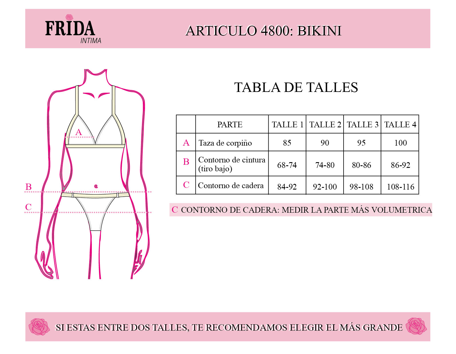 Talles y equivalencias aproximadas : 1 = 85 de corpiño , 2 = 90 de corpiño, 3 = 95 de corpiño, 4 = 100 de corpiño.