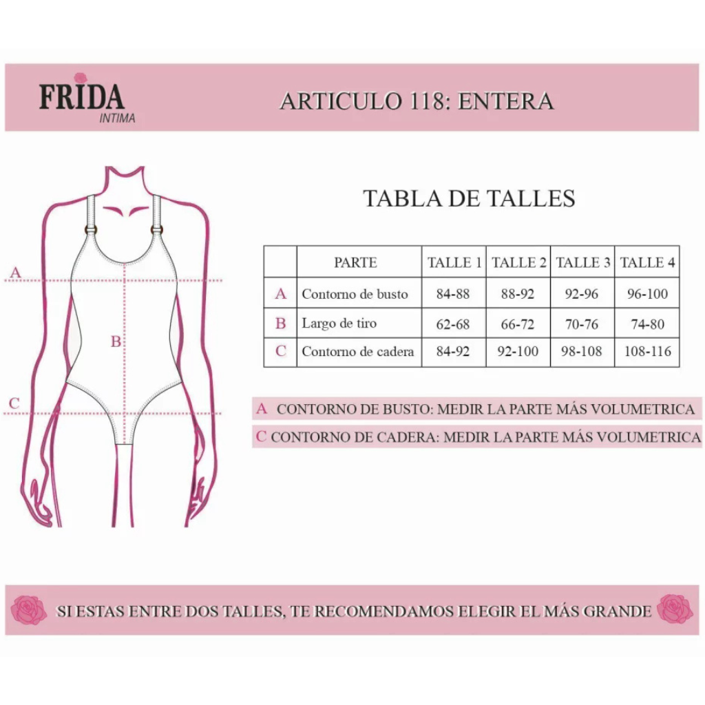 Enteriza, confeccionado con tela tricot, el diseño superior es de corte redondo con accesorios en la parte delantera y tiras anchas, en la parte de atras tiene las tiras cruzadas, es vedetina tipo semiless. Marca Frida Art.118